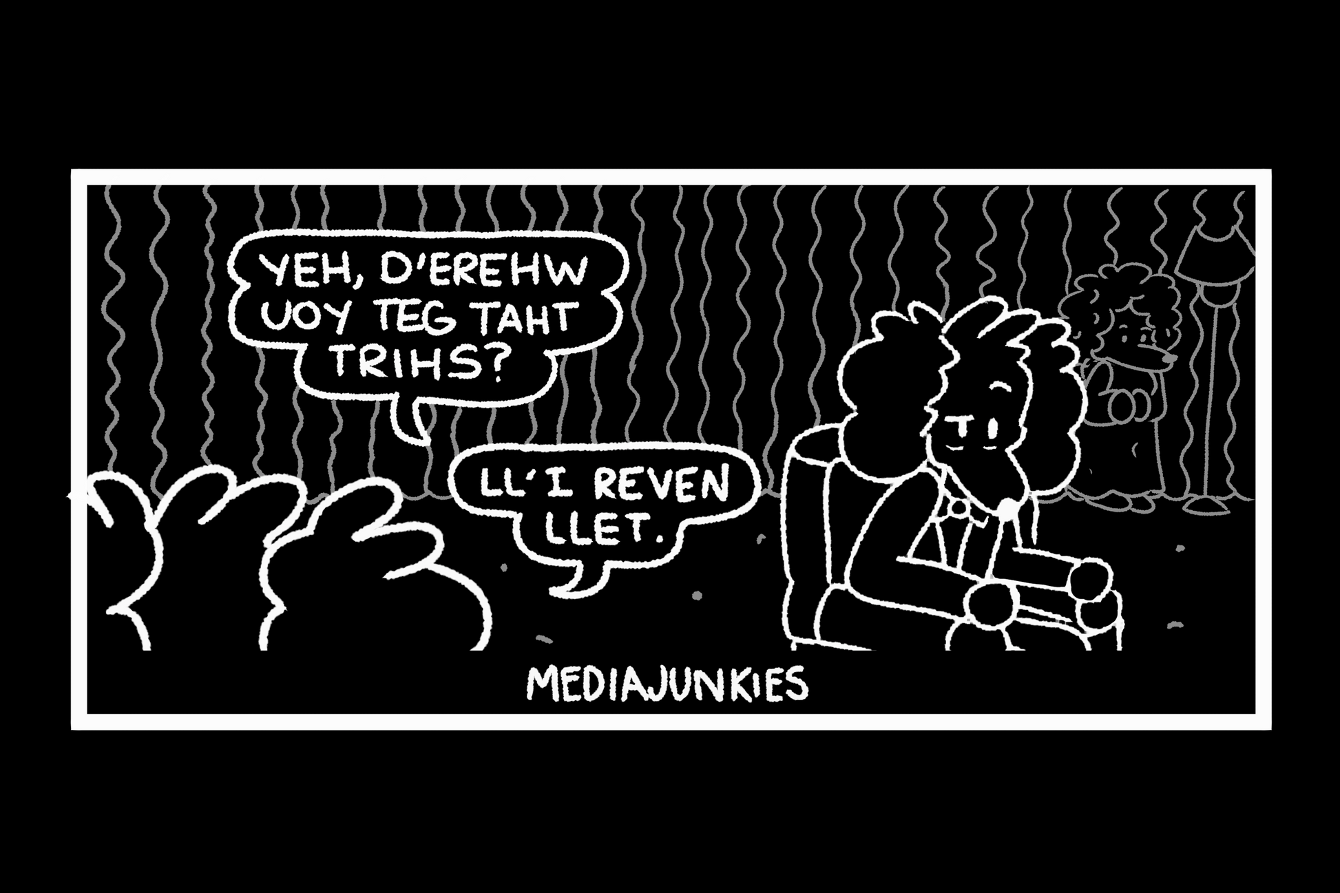 Backwards talking dogs printed on 65% cotton, 35% polyester hoodie.